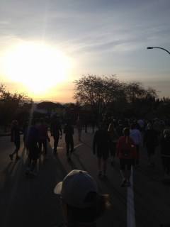 Then yesterday was race day. The alarm was set for 4 am *yawn*, and although we were tired, we were pumped. We consumed bagels, muffins, bananas and the like, and before we knew it, we were off to find the starting line. Both the marathon and half marathon course maps were changed for this year and very much set up to take advantage of public transit. Our hotel was located close to the Canada Line, one stop north of where we needed to go, so we made our way to the station… and apparently so did everyone else running that morning! The trains were completely packed. Thankfully we didn’t have to travel long.