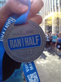And what a fantastic run it was. Vancouver is such a gorgeous city, and every time I’m there, I realize how much I miss it since my semester there in 2006. The course took us from Queen Elizabeth Park, down Cambie street with scenic downtown Vancouver and the mountains in the distance; we ran through Chinatown and trendy Yaletown; along the beaches of English Bay and into Stanley Park; we passed BC runner Harry Jerome (100-metre run bronze medalist at the 1964 Tokyo Olympics); and then we endured the final stretch on Hastings Street downtown, close the Vancouver Convention Centre. I took the time to enjoy the scenery, admire my surroundings, and reflect on the going-ons in my life, while running a race of which I am proud. I even had time for a few photos. Crossing that finish line was an incredible feeling. In the end, my chip time was 2:02:34 and my gun time was 2:10:57. My average pace was 5:49, and I’m quite pleased with my results :). But my concern wasn’t the time. Running this race with two of my good friends in beautiful Vancouver was priceless :).