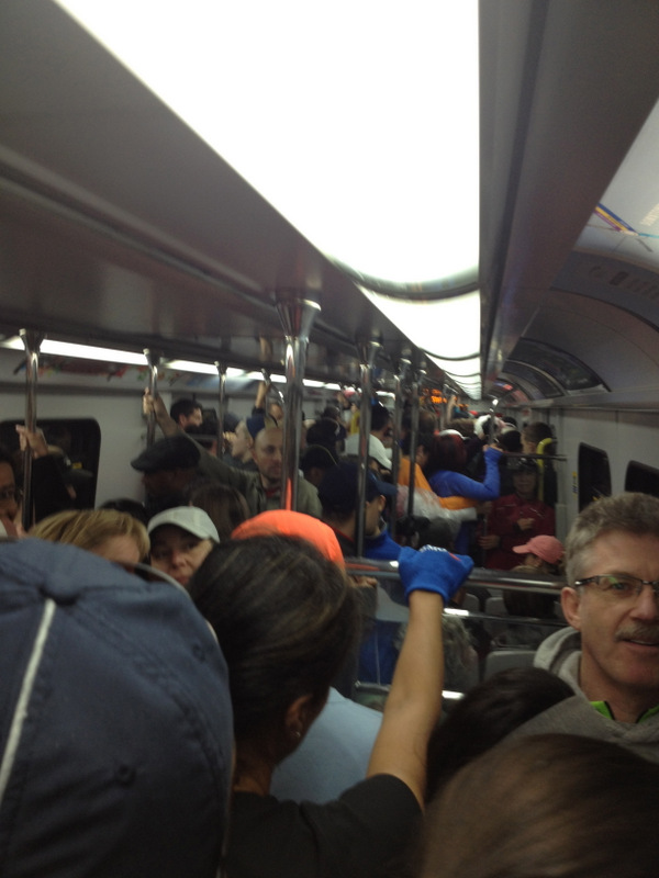 Then yesterday was race day. The alarm was set for 4 am *yawn*, and although we were tired, we were pumped. We consumed bagels, muffins, bananas and the like, and before we knew it, we were off to find the starting line. Both the marathon and half marathon course maps were changed for this year and very much set up to take advantage of public transit. Our hotel was located close to the Canada Line, one stop north of where we needed to go, so we made our way to the station… and apparently so did everyone else running that morning! The trains were completely packed. Thankfully we didn’t have to travel long.