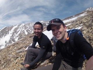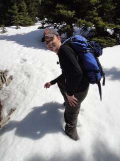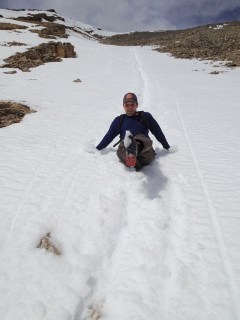 Once we began hitting large patches of snow, we figured we’d try and slide down the mountain on our feet. Again, this seemed like a good idea, and in theory, we could cut down a lot of the descent time. Whether or not we were successful, it sure was fun! Paul even thought ahead of time and brought a garbage bag to act as a toboggan. It was an epic fail though.