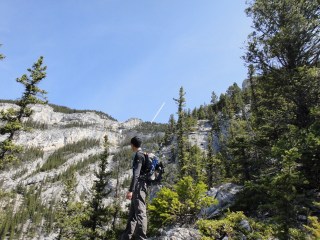 On Saturday, Paul picked me up and I was greeted with the requisite tall Starbucks blonde roast and a breakfast sandwich. Even though he was driving, it really was the least he could do. At this point, we had no idea which peak we wanted to summit, but we knew we wanted something that would leave us with a sense of accomplishment. After perusing Alan Kane’s “Scrambles in the Canadian Rockies” (which is the bible for scrambles in the Canadian Rockies), we decided to try Grotto Mountain off of Bow Valley Trail (Highway 1A) and close to Canmore. It was rated as an easy to moderate scramble, depending on the route, and should take 5 – 8 hours. We assumed it would take us 5, since we’re pretty fit and have done many scrambles before. Also, the book notes that it can be ascended as early as April, so we figured it would be a great choice. En route, we passed a herd of Rocky Mountain bighorn sheep before reaching the trailhead near the