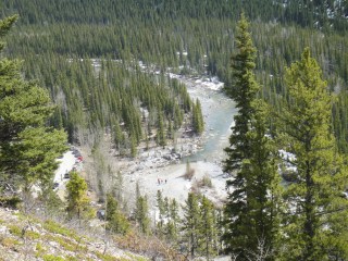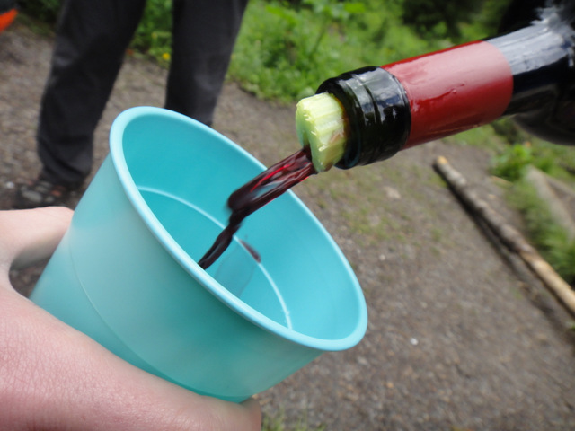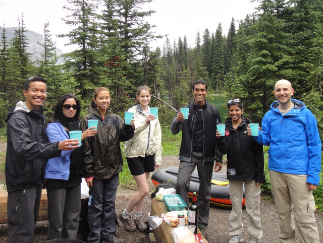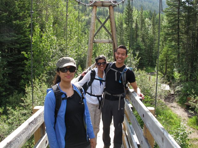 The hike of choice was Lillian and Galatea Lakes Trail, about 30 km south on Highway 40. As with all hikes in the Rockies, it was beautiful. There are many bridges that cross Galatea creek along the way before reaching Lillian Lake. Due to time, we opted not to proceed to Galatea Lake, and instead stopped at Lillian Lake to feast. You see, we eat like royalty on these birthday hikes! Thanks to everyone’s contributions, we had bread, cheese, back bacon and turkey, malbec wine, grapes and cherries, pepperoni sticks, veggies and dip, and of course, birthday cake. There was definitely enough food to go around! We ran into a snag when we forgot a wine opener, but thankfully we were able to use a knife to push the cork into the bottle, and then thanks to Robbie, we used a celery stick as a spout to keep the wine flowing. Genius!