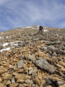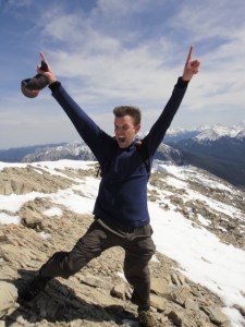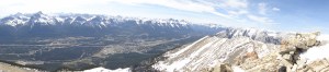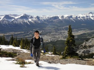 Things became a bit more complicated when we reached snow and had difficulty finding the trail, but we eventually figured things out.  It was amazing to realize how deep the snow was in the mountains :S. Then we hit the scramble, which was quite intense due to even more snow. There were several times, for safety reasons, that we almost called it quits. But after much perseverance, we reached the summit. And, boy, were the views ever gorgeous. Throughout the entire ascent, Canmore sat in the distance below. We gradually passed Ha Ling’s elevation, and then East End of Rundle’s elevation, and countless other peaks. Snow-capped, majestic mountains surrounded us. At the top of Grotto, we found a canister (yippie!), which we gladly signed to celebrate our accomplishment. The wind was crazy at the top, so we didn’t stay long and quickly started down the mountain.