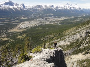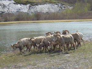 On Saturday, Paul picked me up and I was greeted with the requisite tall Starbucks blonde roast and a breakfast sandwich. Even though he was driving, it really was the least he could do. At this point, we had no idea which peak we wanted to summit, but we knew we wanted something that would leave us with a sense of accomplishment. After perusing Alan Kane’s “Scrambles in the Canadian Rockies” (which is the bible for scrambles in the Canadian Rockies), we decided to try Grotto Mountain off of Bow Valley Trail (Highway 1A) and close to Canmore. It was rated as an easy to moderate scramble, depending on the route, and should take 5 – 8 hours. We assumed it would take us 5, since we’re pretty fit and have done many scrambles before. Also, the book notes that it can be ascended as early as April, so we figured it would be a great choice. En route, we passed a herd of Rocky Mountain bighorn sheep before reaching the trailhead near the Alpine Club of Canada.