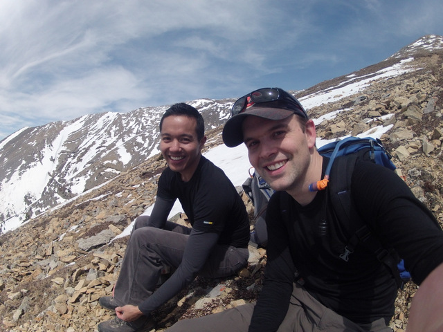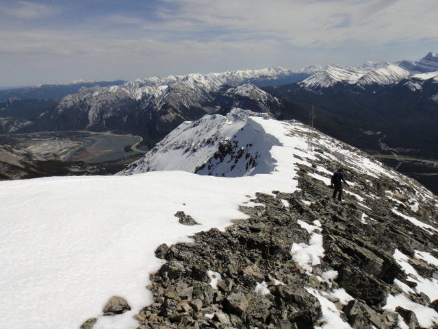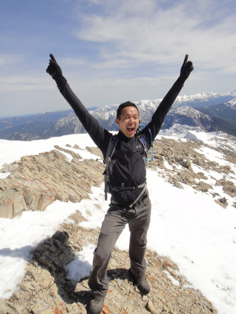 Things became a bit more complicated when we reached snow and had difficulty finding the trail, but we eventually figured things out.  It was amazing to realize how deep the snow was in the mountains :S. Then we hit the scramble, which was quite intense due to even more snow. There were several times, for safety reasons, that we almost called it quits. But after much perseverance, we reached the summit. And, boy, were the views ever gorgeous. Throughout the entire ascent, Canmore sat in the distance below. We gradually passed Ha Ling’s elevation, and then East End of Rundle’s elevation, and countless other peaks. Snow-capped, majestic mountains surrounded us. At the top of Grotto, we found a canister (yippie!), which we gladly signed to celebrate our accomplishment. The wind was crazy at the top, so we didn’t stay long and quickly started down the mountain.